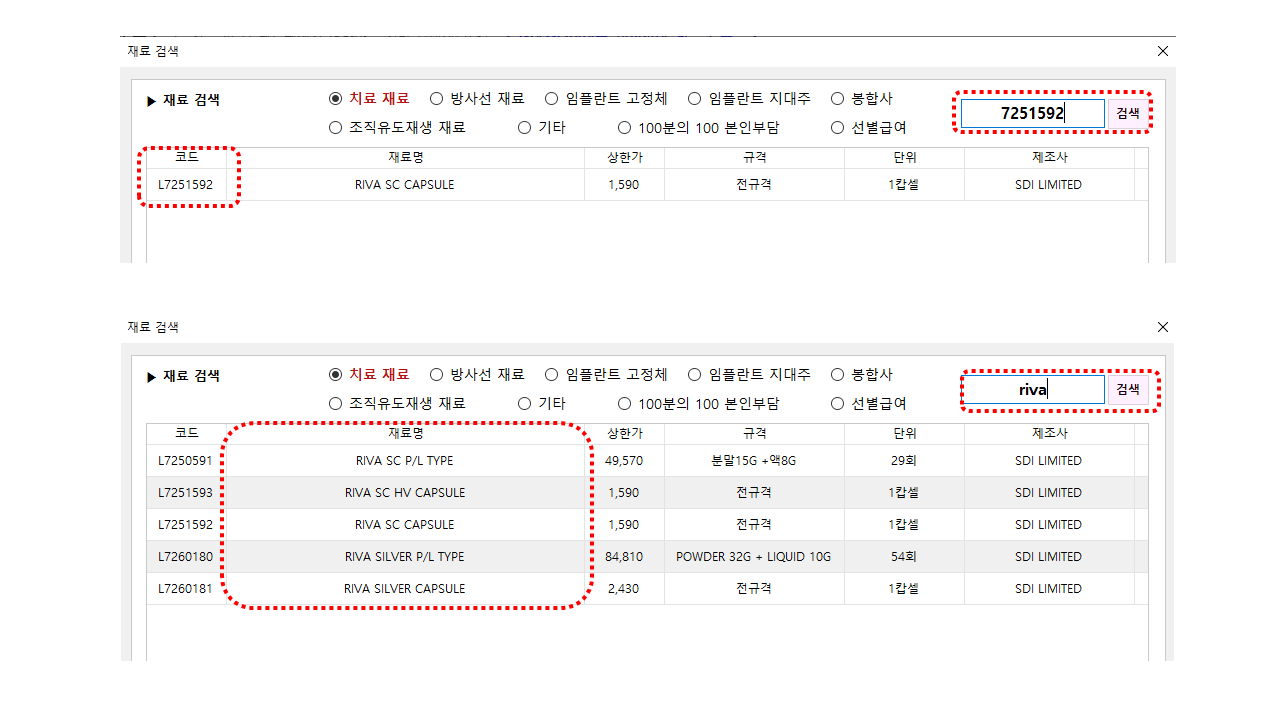 상한가 확인은 치료재료 검색 버튼을 누르면 확인할수있습니다.