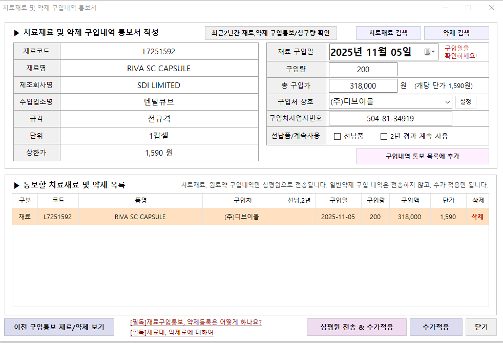 심평원 전송/수가적용 : 구입 내역을 심평원에 전송(통보)하고, 프로그램 내부에 구입 단가도 적용시킵니다. 단, 약제구입내역은 심평원으로 전송되지 않으며, 프로그램 내부에 단가만 적용(수가적용)됩니다.