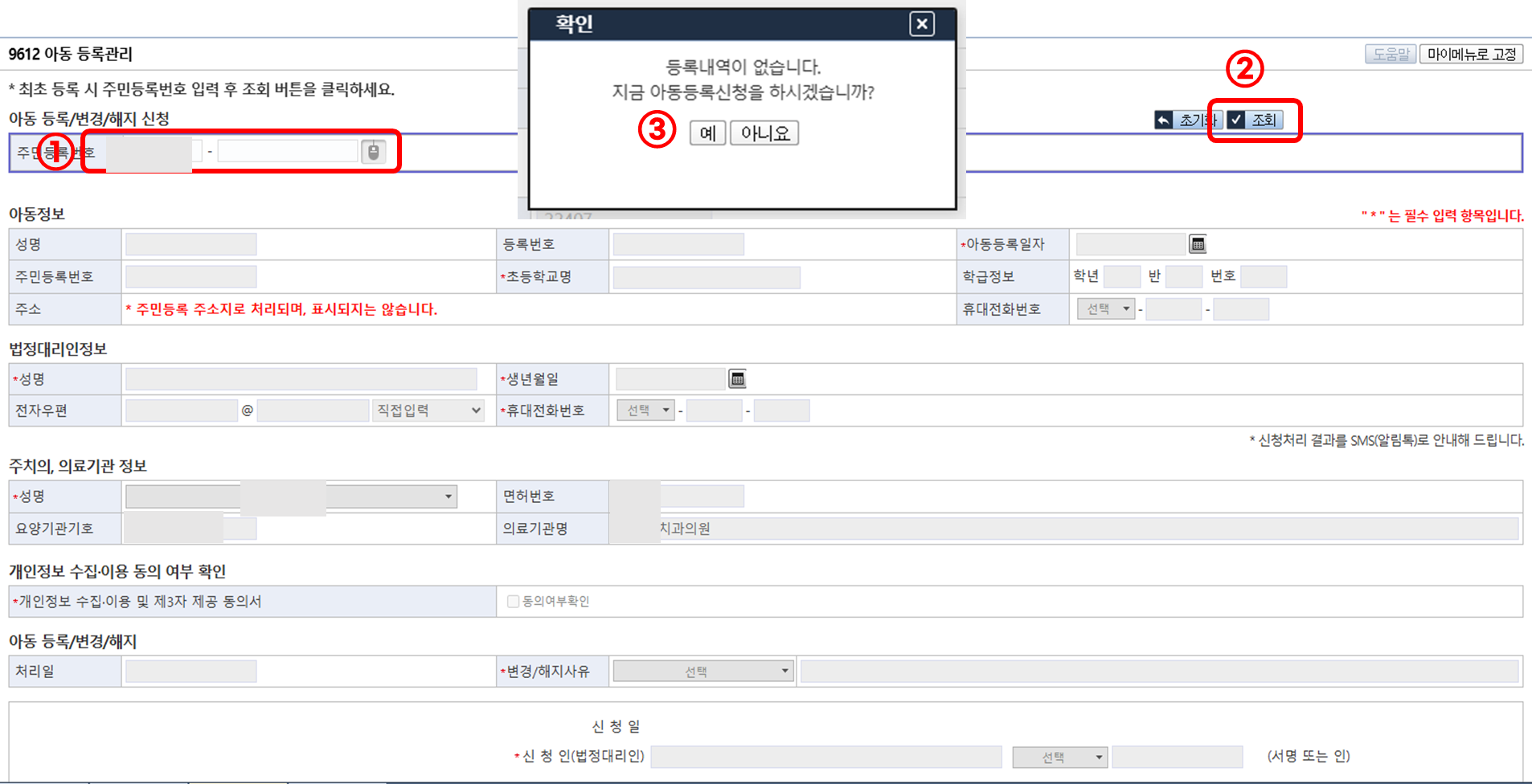 아동 주민번호를 입력후 조회해주세요