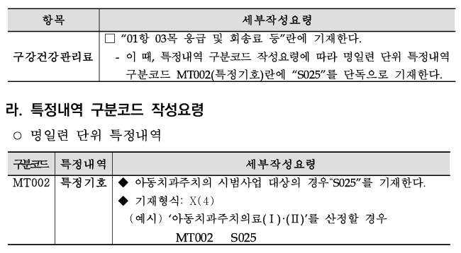 마. (특정내역 기재) 시범사업 청구명세서의 명일련 단위 특정내역 구분코드 MT002란에