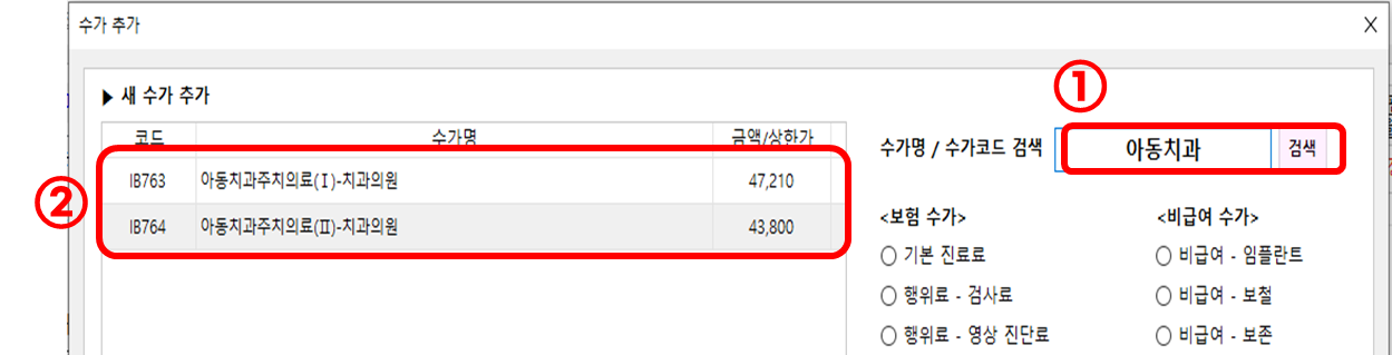 수가명/수가코드 검색 창에 아동치과주치의로 검색하면